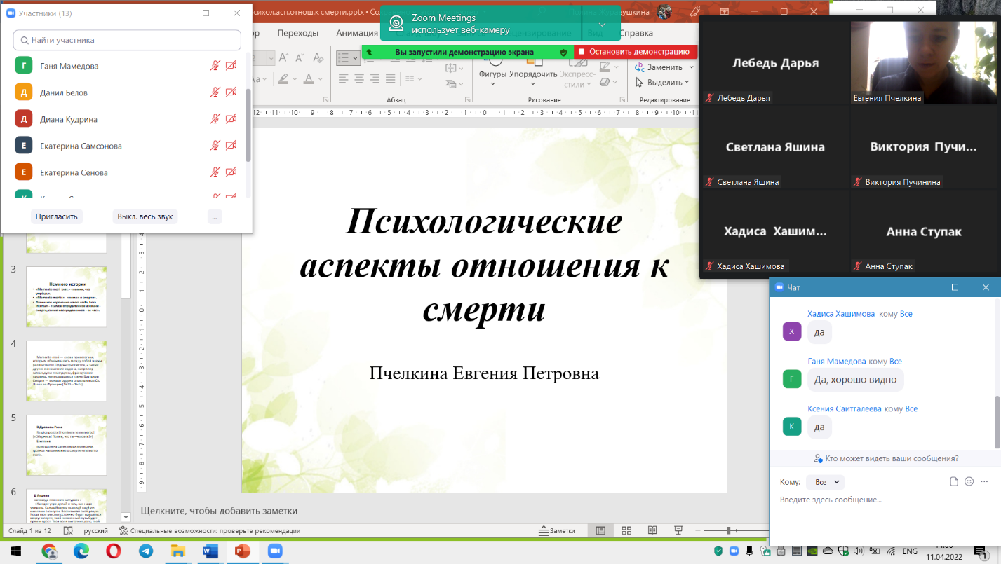 11 апреля доцент кафедры общей и клинической психологии Пчелкина Евгения Петровна провела мастер-класс «Психологические аспекты отношения к смерти». Ответственной за мероприятие выступила кафедра общей и клинической психологии. Участники мастер-класса познакомились с некоторыми современными тенденциями и психологическими аспектами отношения к смерти в современной России и мире. В целом сегодня о смерти все знают, но стараются как можно меньше о ней говорить, как бы ее не замечать. Это имеет определенные психологические последствия повышения страха смерти и беспечно-инфантильного отношения к жизни.