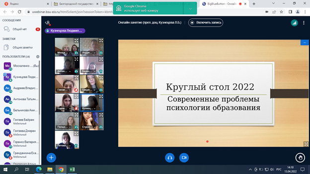 13 апреля на кафедре психологии состоялся круглый стол «Современные проблемы психологии образования». С докладами по актуальным психологическим проблемам современного образования выступили студенты-будущие педагоги различных профилей подготовки Педагогического института. Выступающие представили результаты своих экспериментальных психологических исследований, выполненных под руководством преподавателей кафедры психологии, доцентов Корнеевой Светланы Анатольевны, Кузнецовой Людмилы Борисовны, Москаленко Светланы Валерьевны. Были рассмотрены такие важные вопросы, как: возможности методов альтернативной коммуникации в работе педагога с людьми с ограниченными возможностями здоровья, мотивы коммуникативной активности подростков в образовательном процессе, динамика эмоционального состояния школьников в течении учебной недели, особенности эмоционального состояния учащихся в условиях дистанционного обучения и др. Участниками конференции был отмечен высокий научный уровень представленных докладов, содержащих анализ материала, полученного авторами, как из собственных эмпирических исследований, так и в ходе анализа данных теоретических источников за последние несколько лет.