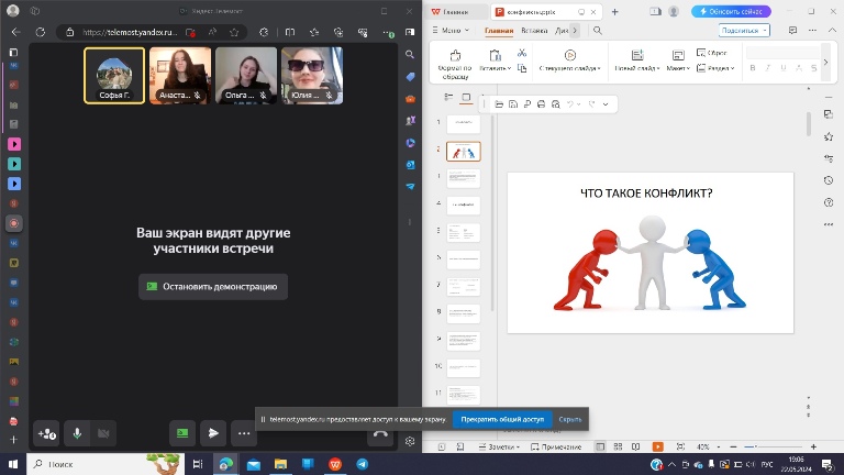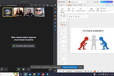 Ведущая Софья Говоруха (гр. 02062102) вместе с участниками встречи обсудили следующие вопросы: что такое конфликт, виды конфликтов, какие плюсы и минусы конфликтов существуют, а также способы поведения в конфликтных ситуациях.