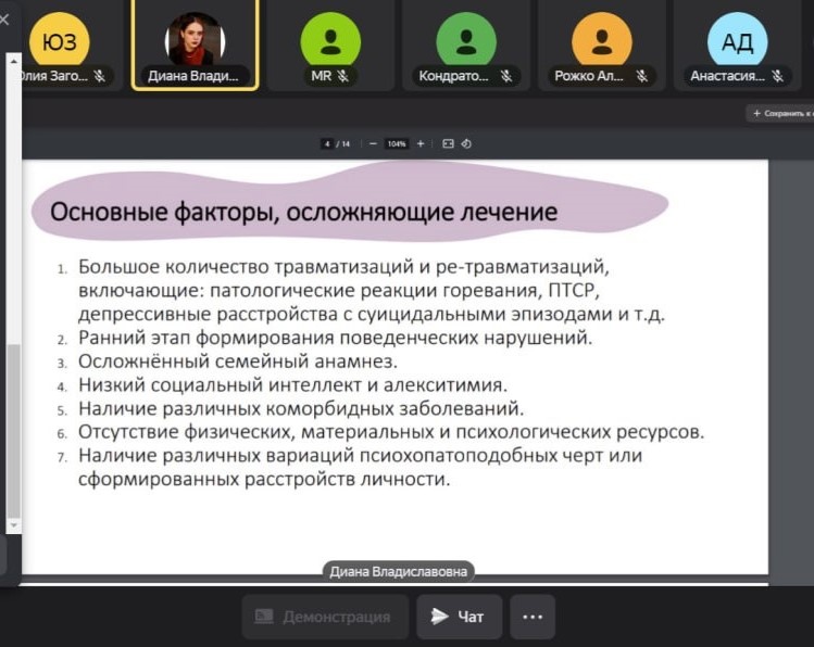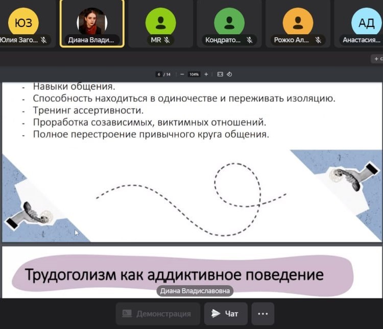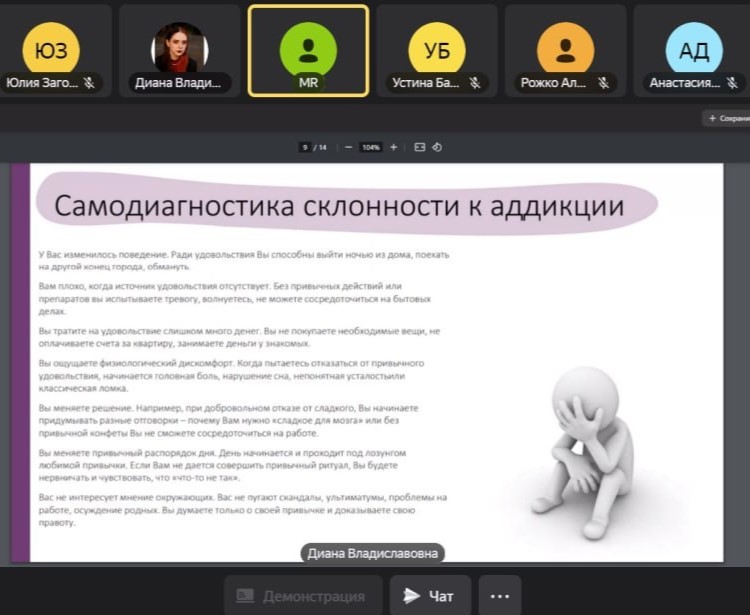 Ведущие Диана Анциферова (гр. 02062002) и Юлия Загоруйко (гр. 02062102) рассказали студентам, что такое аддикция, какие виды аддикций существуют. Рассмотрели факторы, которые влияют на формирование зависимого поведения и какие препятствия возникают в процессе лечения. Ребята прошли самодиагностику на предрасположенность к аддикциям.