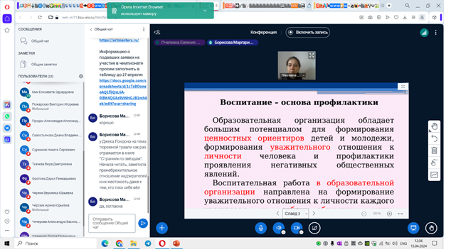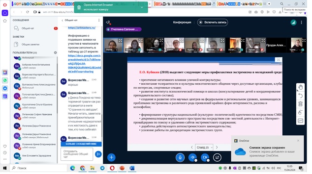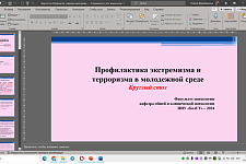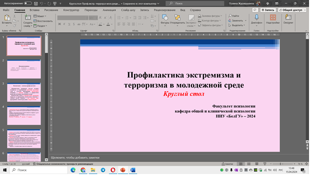 15.04.2024 на факультете психологии в рамках Недели науки под руководством доцента кафедры общей и клинической психологии Пчелкиной Е.П. был проведен Круглый стол: «Профилактика экстремизма и терроризма в молодежной среде».