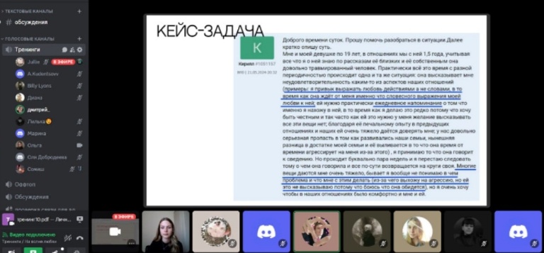 Участники тренинга решили кейс-задачу – как помочь молодому человеку, который боится делиться мыслями со своей второй половинкой. Благодаря этому упражнению, ребята узнали, как вести себя при разговоре с партнером, чтобы он чувствовал себя услышанным.